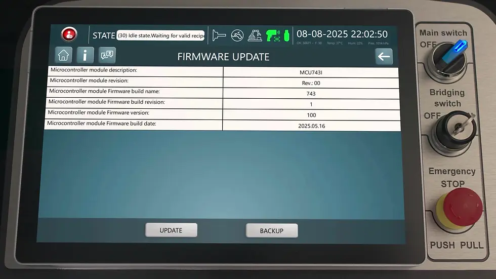 Das Interface der Multistage CSM-150.30-V1 unterstützt Backup & Restore von Systemeinstellungen und Rezeptdatenbanken auf externe Medien. So können Maschinendaten schnell wiederhergestellt oder auf weitere Maschinen geklont werden. Zusätzlich sind Software- und Firmware-Versionen jederzeit im Systemmenü einsehbar, was Transparenz, einfache Wartung und effiziente Prozesskontrolle gewährleistet.